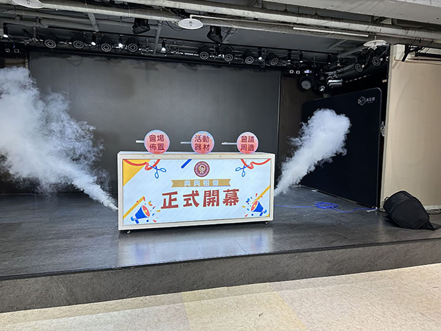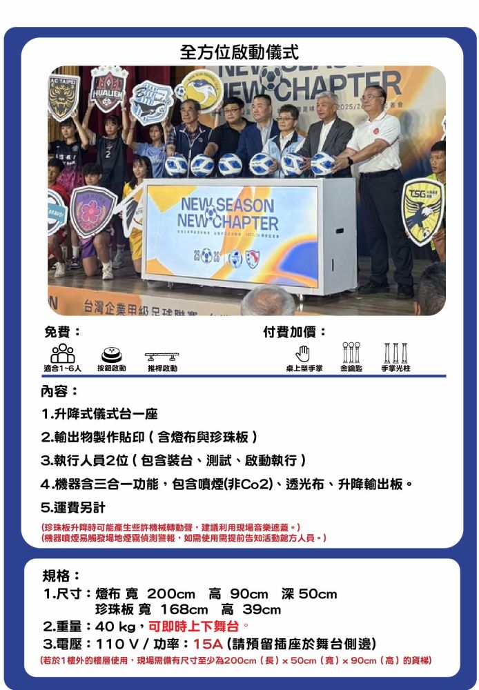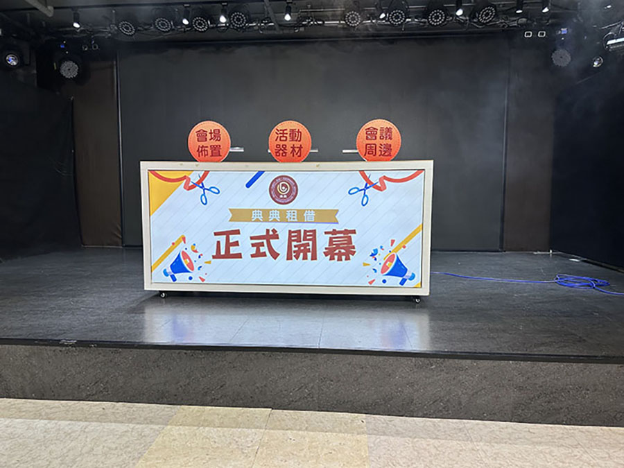 3.啟動儀式道具建議於啟動前後置放於舞台上,如需即時上下舞台,則舞台需有斜坡道。若無斜坡道且舞台高度高於45公分,需由活動主辦方提供人力協助道具上下舞台。