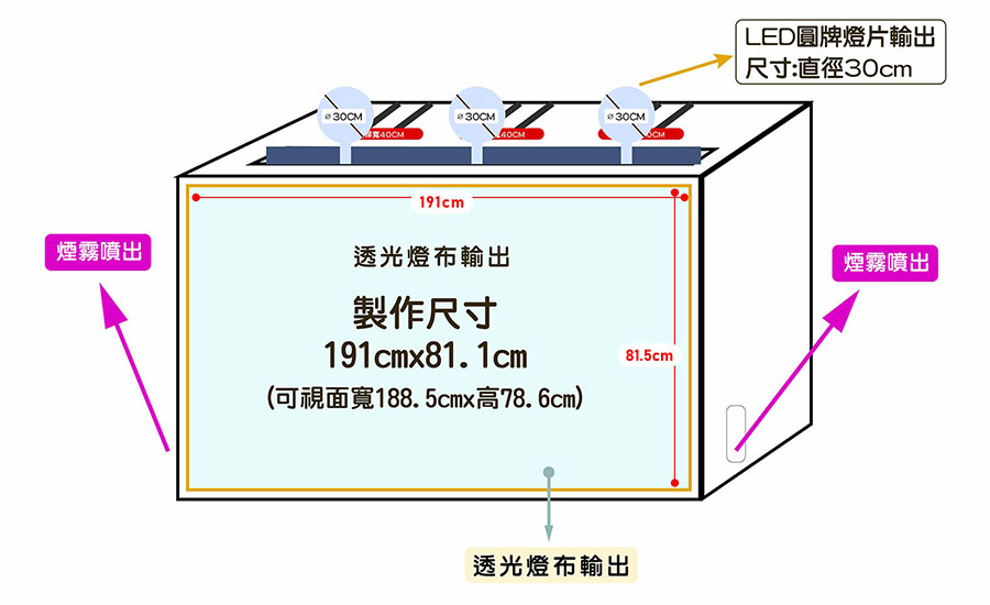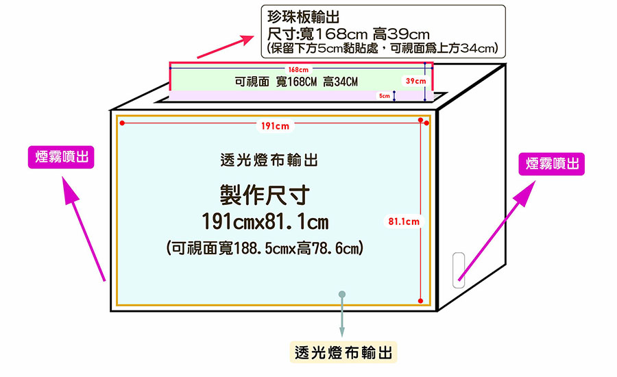1.透光燈布 : 製作尺寸191cmx81.1cm(可視面 寬188.5cmx高78.6cm)