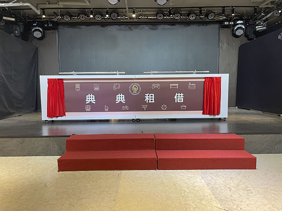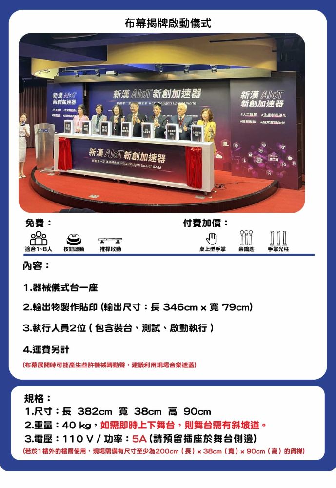 3.啟動儀式道具建議於啟動前後置放於舞台上,如需即時上下舞台,則舞台需有斜坡道。若無斜坡道且舞台高度高於45公分,需由活動主辦方提供人力協助道具上下舞台。