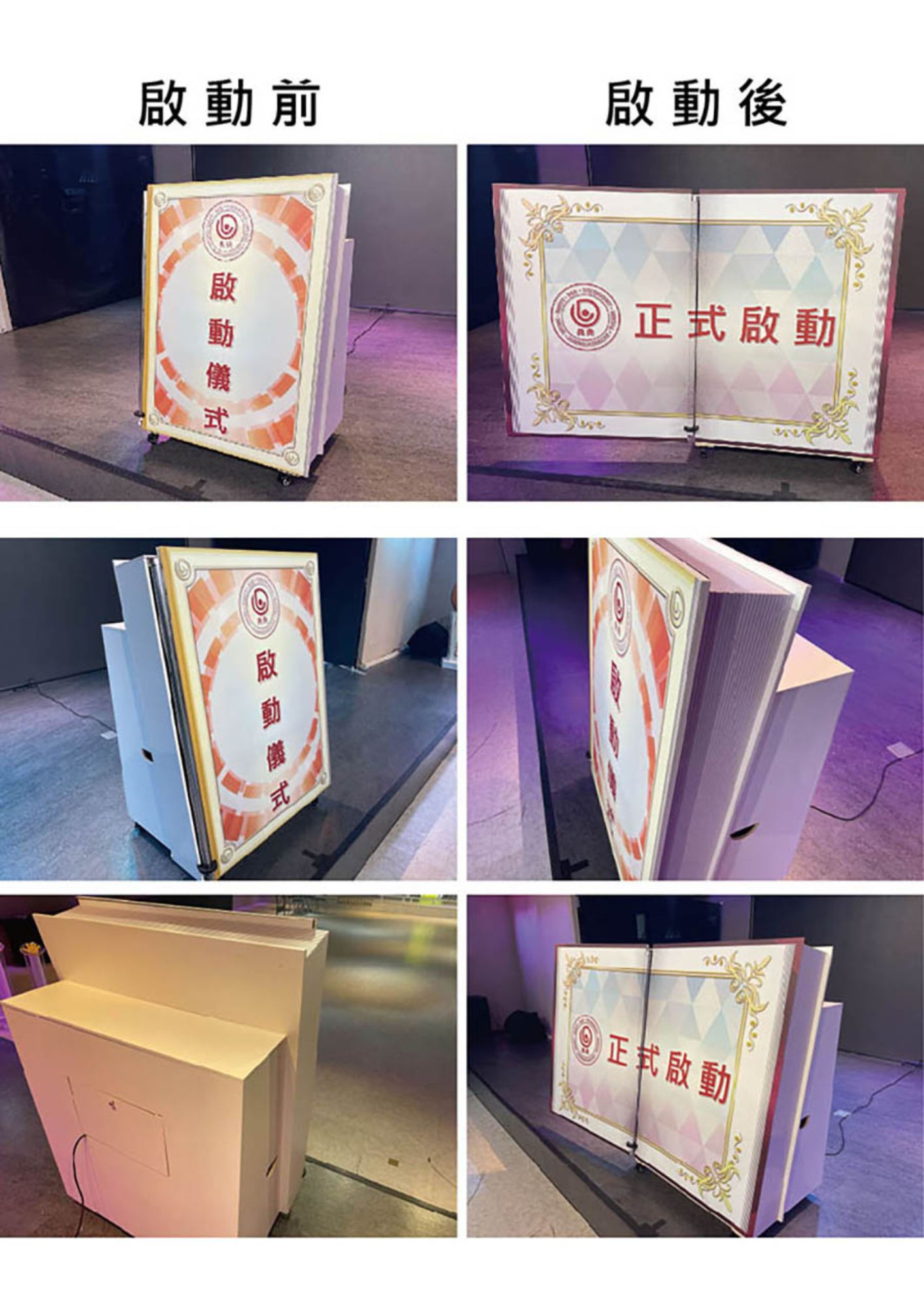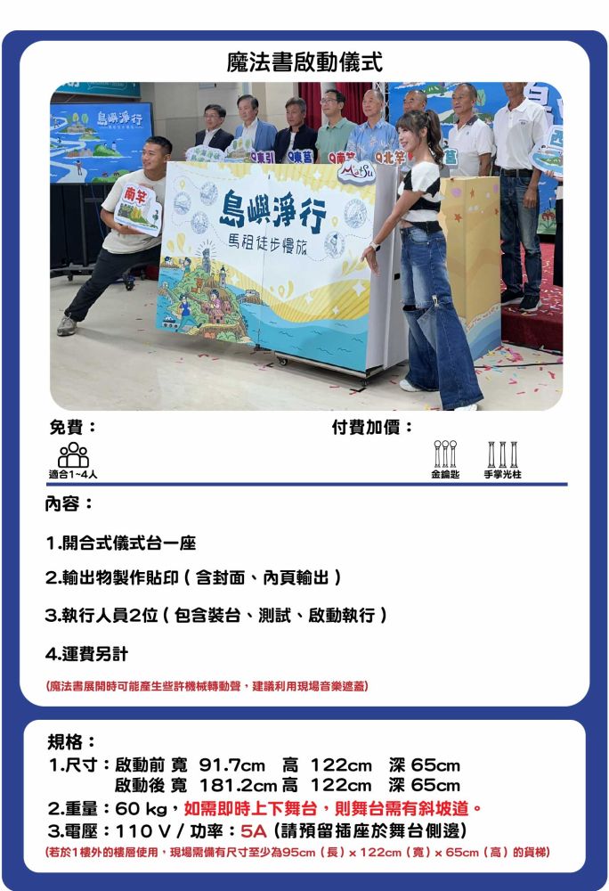 3.啟動儀式道具建議於啟動前後置放於舞台上,如需即時上下舞台,則舞台需有斜坡道。若無斜坡道且舞台高度高於45公分,需由活動主辦方提供人力協助道具上下舞台。